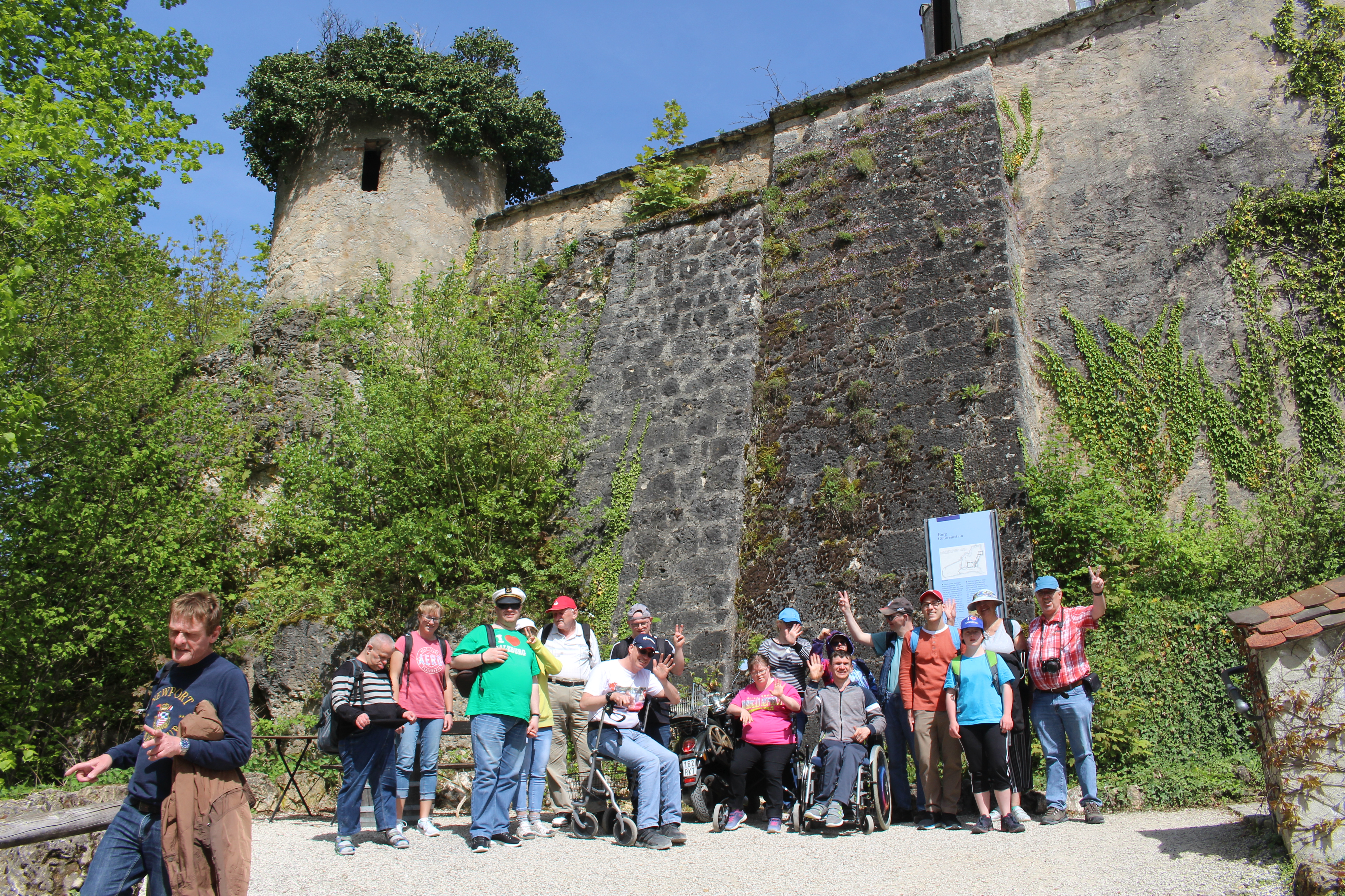 Dritter Tag: Gut gemeint ist nicht immer gut gemacht. Heute sind wir nach dem Frühstück aufgebrochen mit dem Ziel den Freizeitpark Schloss Turn zu besuchen. Also haben wir uns frohen mutes mit den Bussen aufgemacht eine Stunde dort hin zu fahren. Nach einer kurzweiligen Fahrt haben wir dann auch unser Ziel erreicht. Doch, schreck vor Ort wurden wir schnell auf den Boden der Tatsachen zurück geholt. Auf einem Schild am Eingang des Parkes, stand ein Schild: Wir haben heute geschlossn und öffnen am Wochenende wieder für unsere Gäste. Nach einem kurzen "Rat" zwischen Marianne, Sandra und Ben kam die Entscheidung. Wer eine Freizeit organisiert muss auch improvisieren können und spontan sein. Also wurde umdisponiert und statt einen Park mit einem Schloss zu besuchen, sollte es eine Burg (ohne Park) werden. Nach einer weiteren Autofahrt kamen wir also um die Mittagszeit an der Burg Gössweinstein an. Dort erwartete uns ein Aufstieg zur Burg der von allenn mit Bravour gemiestert wurde. Doch kurz vor dem triumphfalen Einzug stellte sich eine weitere Herausforderung. Man ahnt es schon, der Zugang besteht aus einer Treppe und der Beobachter weiß Treppen und Rollstühle, sowie Rolatoren (Ferraris) sind nicht das was man kompatibel nennt. Doch frei nach dem Motto - wer Barrieren abbauen will, muss im eigenen Kopf anfangen - haben wir auch dieses Hindernis genommen und mit freundlicher Unterstützung zweier Radfahrer überwunden. Zur Feier und Belohnung von uns allen, gab es dann ein kaltes Getränk für alle und die Möglichkeit die Burg zu besichtigen. Auch hier hätten Treppen ein Hindernis sein können, doch auch diese haben wir wieder nicht gelten lassen und so konnte auch Waldemar sich die Burg ausgiebig anschauen. Lediglich das Verlies war nur für wenige zu besichtigen, jedoch eher auf eigenen Wunsch. Da die Toilette auf der Burg ein Abflussproblem hatte und nicht zu benutzen, tat sich hier eine neue Herausforderung auf. Doch darin bereits geübt sollte uns auch dies nicht aufhalten. Während die Gruppe mit Marianne schon mal vorging um sich die Toilette im Rathaus einmal näher zu besichtigen, holte Ben den Bus während Tine, Andi K. und Waldemar mit Sandra auf den Abholservice an der Burg warteten. So schnell es Sicher und erlaubt war, brachte Ben dann die wartenden dann ebenfalls zur Besichtigung. Zurück in der Juhe konnten sich dann erst einmal alle ausruhen um dann gemeinsam zu Abend zu essen. Nach diesem konnte noch eine Runde gespielt, gebastelt und gemalt werden, bevor es Rotkäpchen vor dem Zubetgehen als Geschichte zu hören gab.